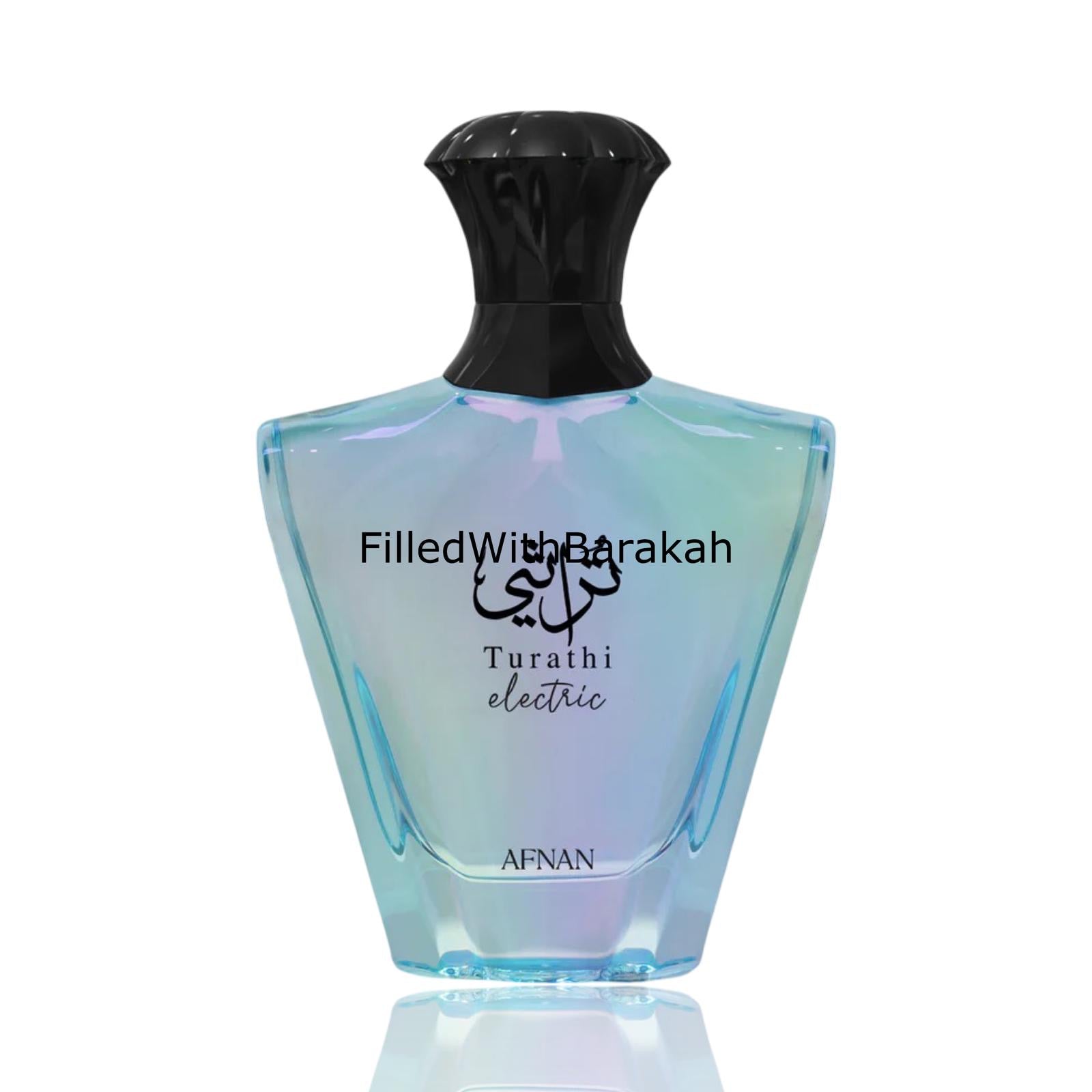 Afnan Turathi Electric es una fragancia frutal-cítrica luminosa, con pera y mandarina sobre un corazón floral-amaderado y un fondo suave de ámbar, vainilla y almizcle, creando un aroma fresco, dulce y muy atractivo.