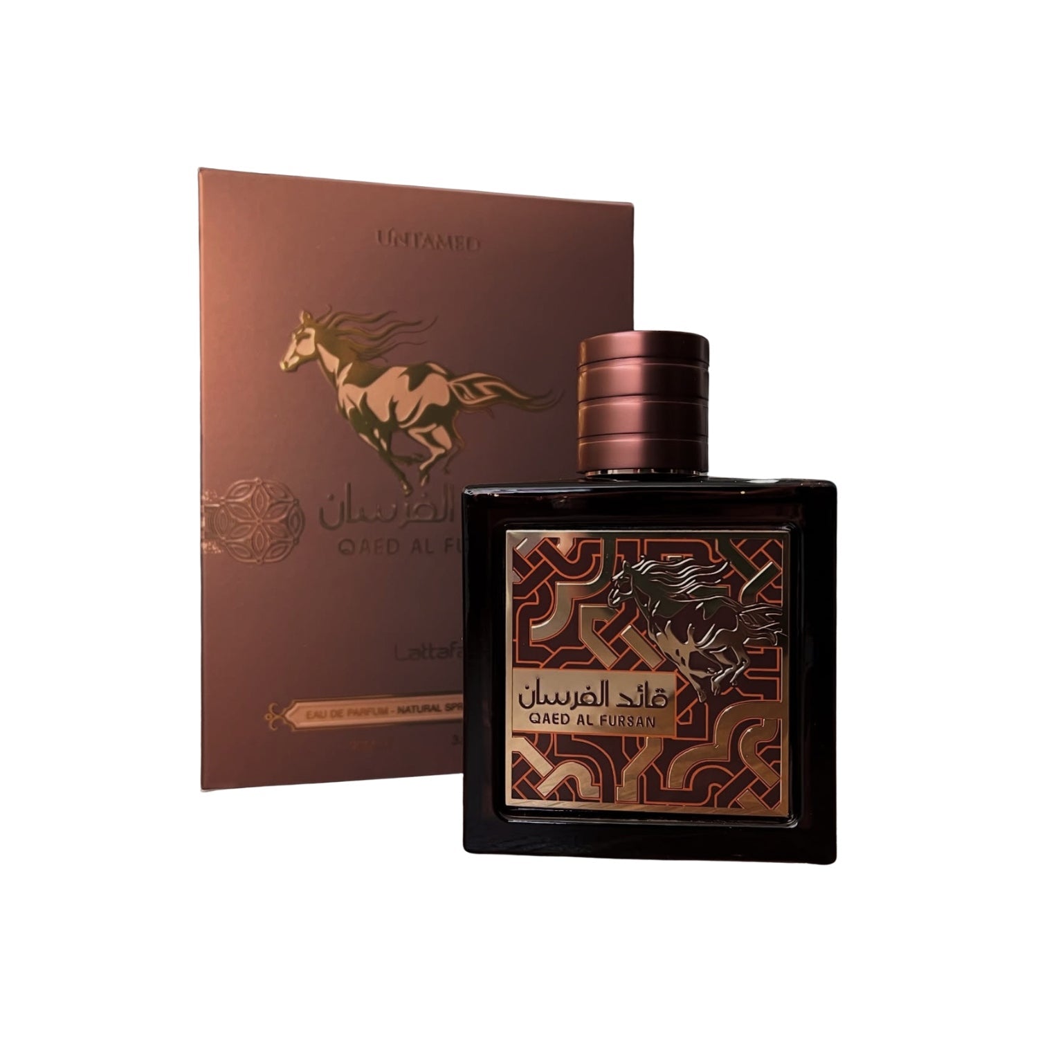 Qaed Al Fursan Untamed es una fragancia audaz y envolvente para hombre, con un perfil especiado-amaderado que mezcla canela, caramelo y lavanda sobre un fondo cálido de ámbar, incienso y vetiver.